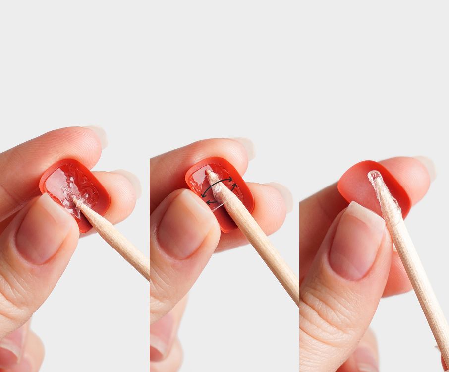 Apply the remover oil to the edges of the nails, massage it in well, and gently loosen the edges of the press-ons with the rosewood stick.