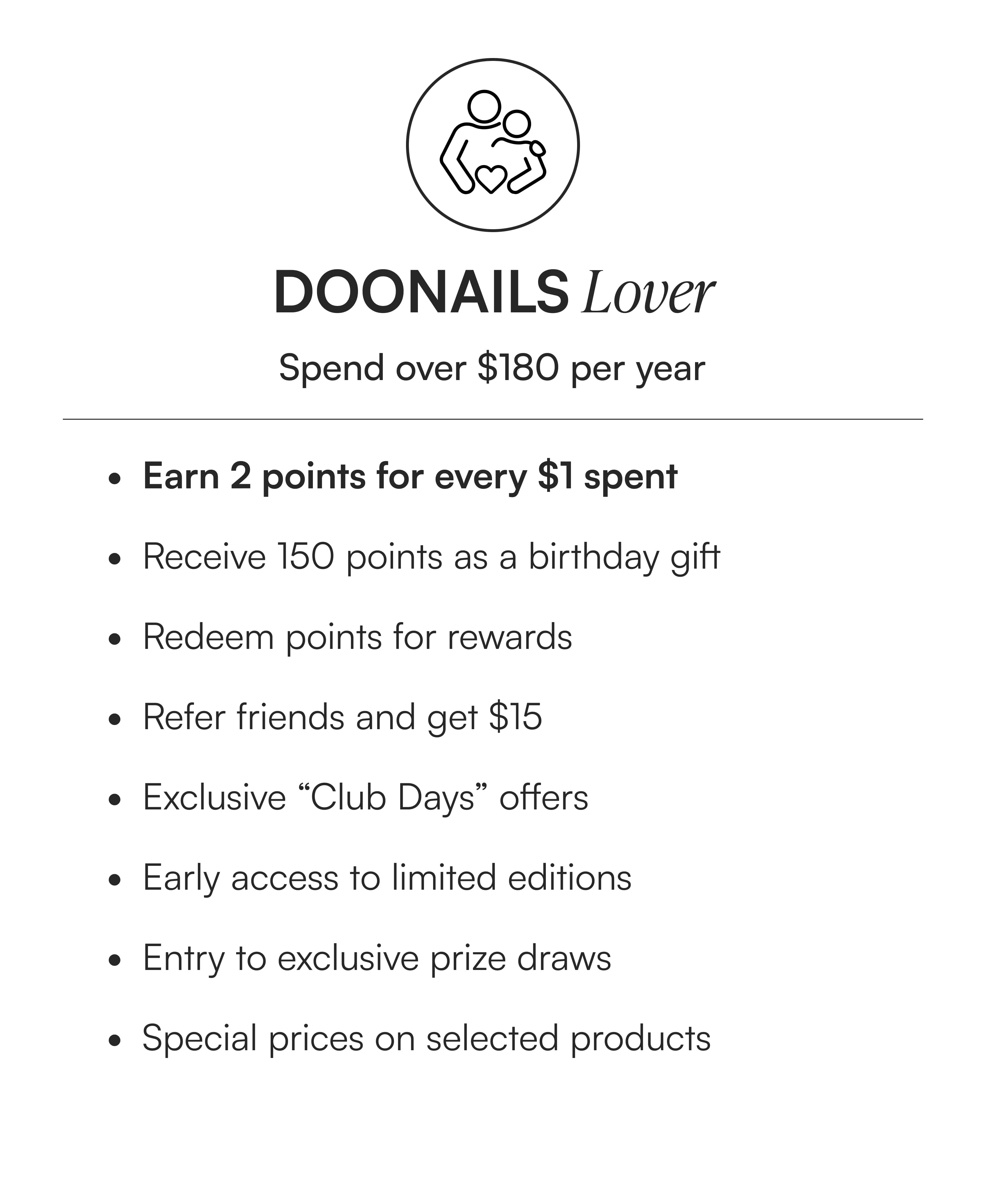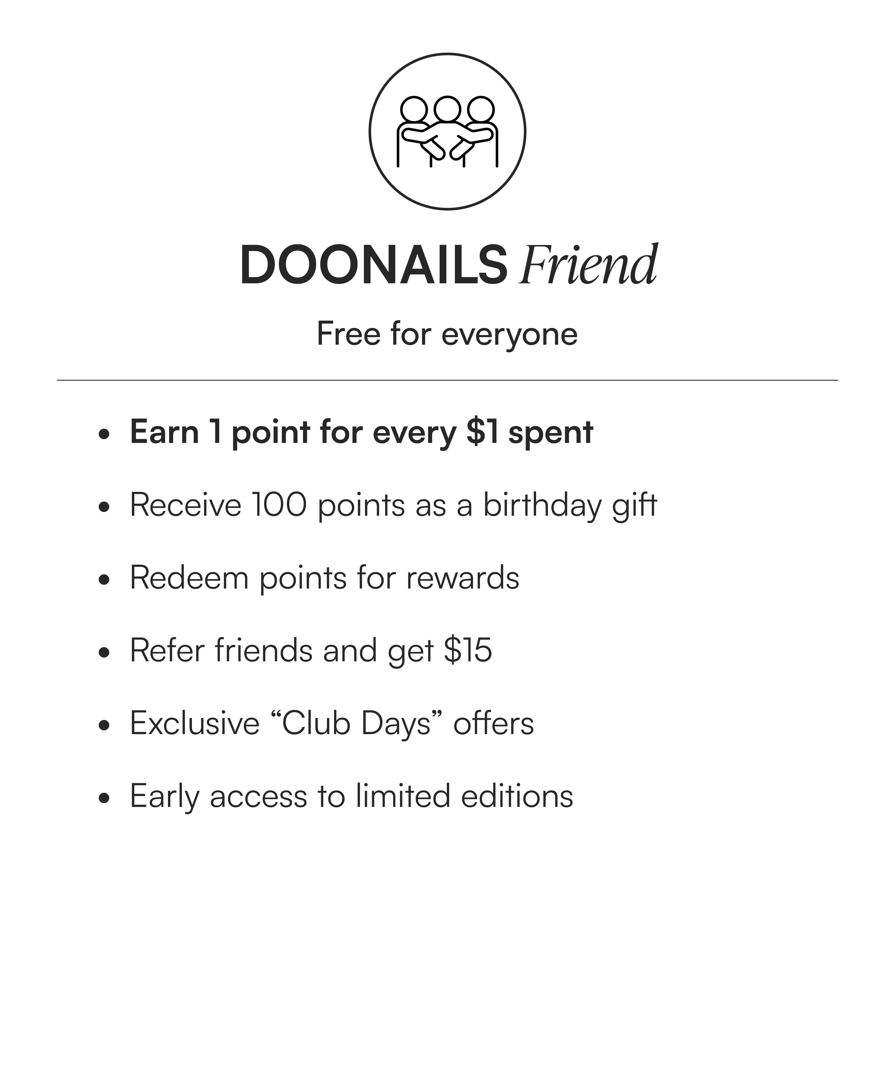 Become part of the Doonails Club! You start at the Doonails Friend level and receive your 100-point sign-up bonus.