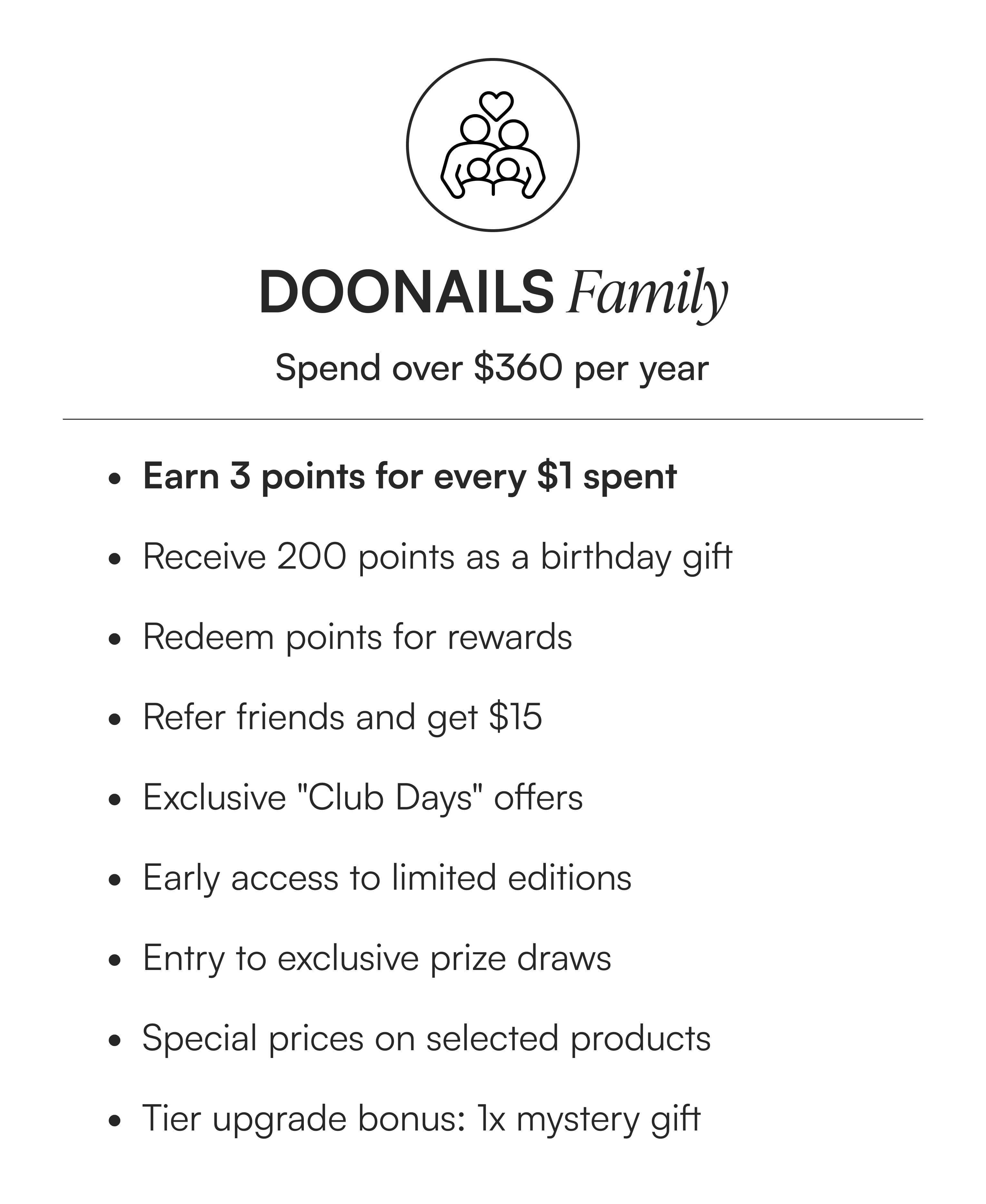 The more points you collect, the higher you level up! From Doonails Friend to Doonails Family - with each level you unlock more exclusive rewards & benefits.